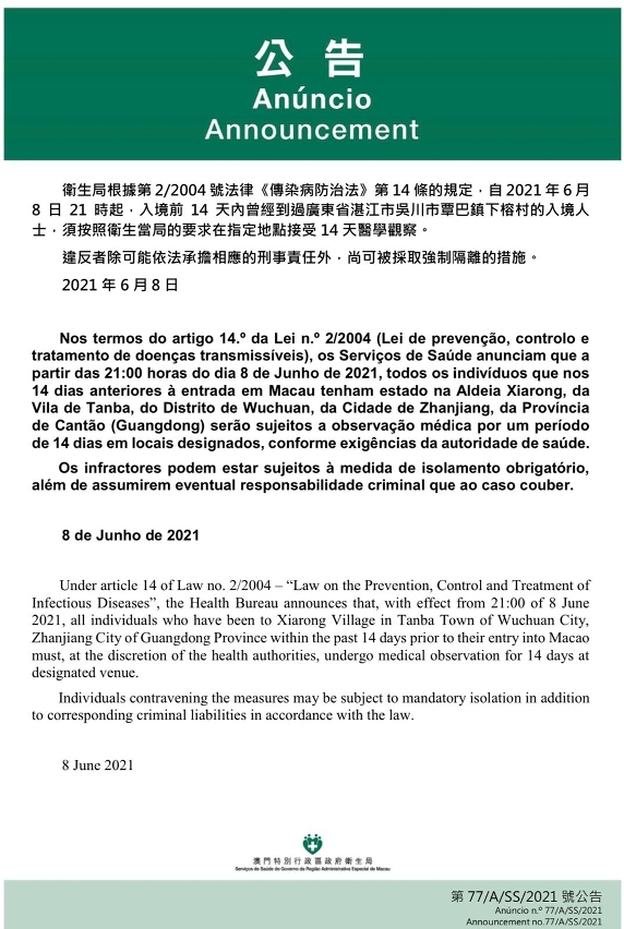 新型冠状病毒感染应变协调中心宣布,因应广东省的疫情变化,卫生局根据第2/2004 号法律《传染病防治法》第14 条的规定,自 2021年6月8日21时起,所有在入境前14天内曾经到过广东省湛江市吴川市覃巴镇下榕村的入境人士,须按照卫生当局的要求在指定地点接受14 天医学观察,违反者除可能依法承担相应的刑事责任外,尚可被采取强制隔离的措施。