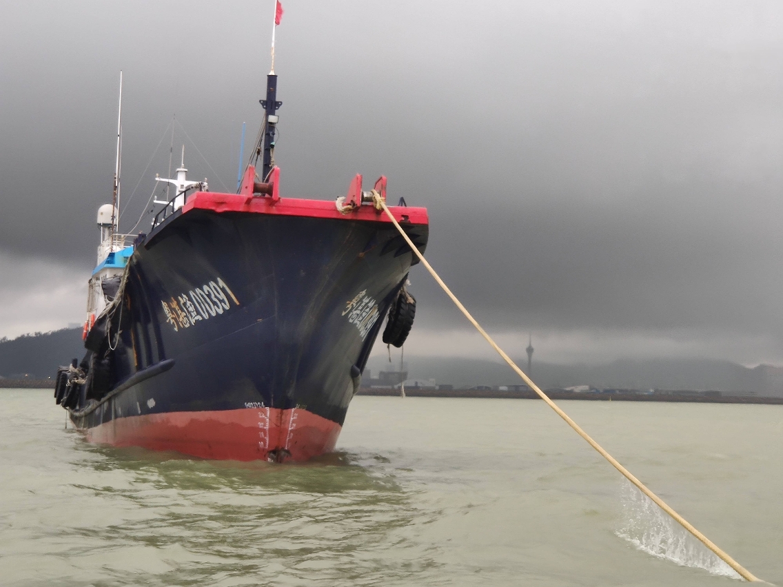 • 肇事渔船停泊在外锚地等待 船首下方有碰撞痕迹