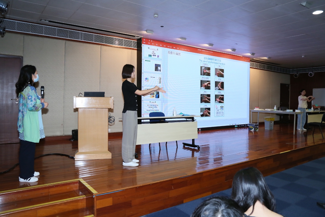 • 卫生局人员示范正确洁手方式。