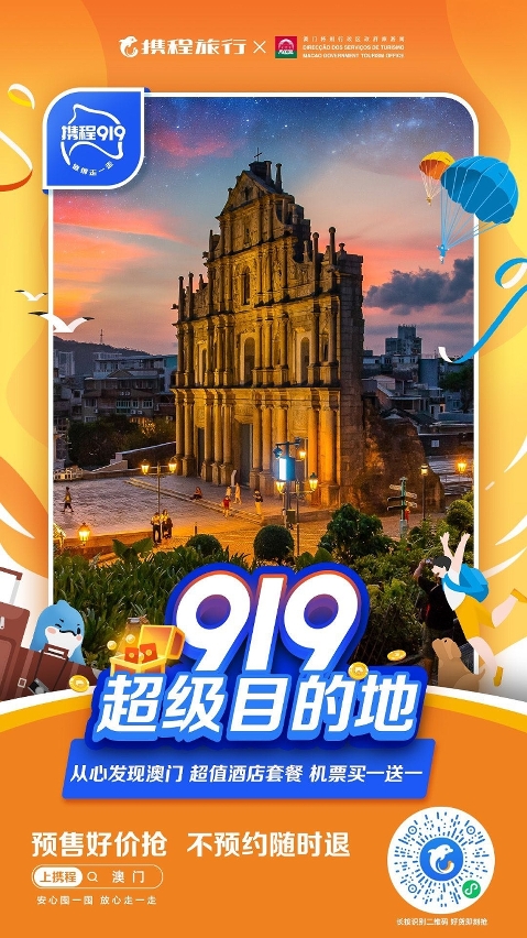 旅游局联同内地大型旅游平台携程,于接下来9月份的大型促销活动中,加设澳门超级目的地专区,由奥运冠军马龙代言,联合业界推出多项优惠促销产品。针对“十.一”国庆假期推出新一阶段酒店五折券及买一送一机票优惠,并与同程旅行联合推出两期99元“澳门盲盒”营销活动,随机抽取包括机票、住宿及餐饮门票等优惠游澳产品,相关线上营销活动反应热烈,微博话题热度已达1,500万。