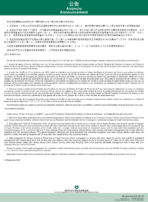 新型冠状病毒感染应变协调中心宣布,因应福建省相关区域的疫情变化,卫生局根据第2/2004号法律《传染病防治法》第10条和第14条的规定要求: