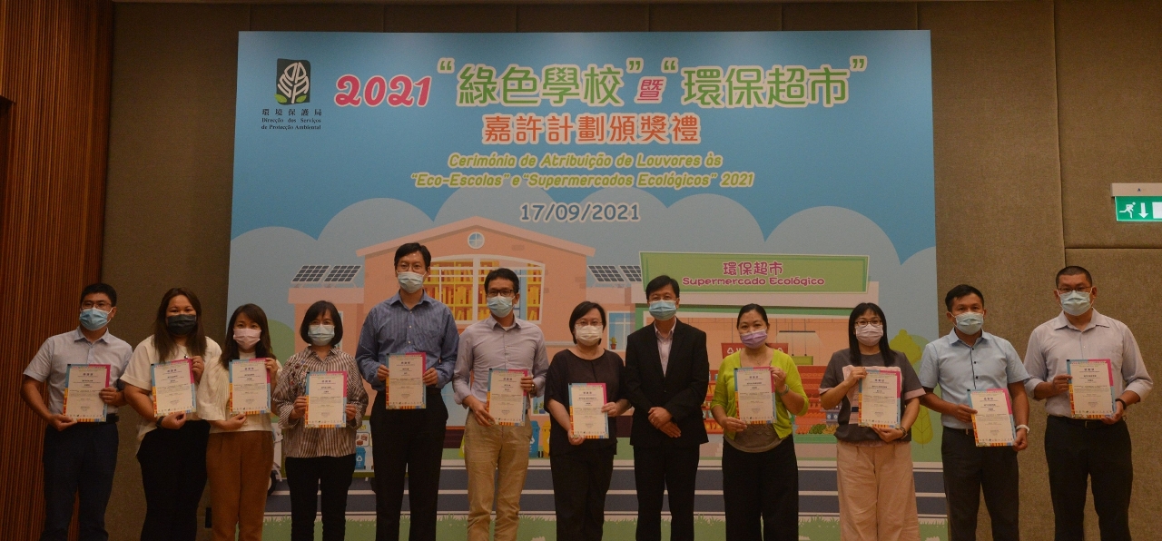 颁奖礼于环保局演讲厅举行,今年合共51所学校参与2021“绿色学校嘉许计划”,经评审最终共35所学校获奖,得奖学校数目为历年之最。今年之“绿色学校白金奖”由菜农子弟学校、氹仔坊众学校及镜平学校(中学部)获得,以表扬连续五年积极开展环境教育工作。同时,今年共26队获得“环保教案设计奖励计划”奖项,得奖作品以多种生动方式推广干净回收、厨余回收、惜食及节能等环保资讯,更于课堂上实践。