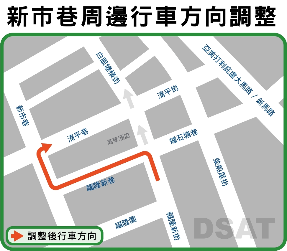 配合市政署于新市巷新建垃圾压缩工程,新市巷周边一带的交通及道路设施需作出相应调整。9月21日(周二)上午10时起,福隆新街与新市巷之间的福隆新巷、福隆新巷与清平巷之间的新市巷改为反方向行车,即来自福隆新街之车辆,可选择左转入福隆新巷,再右转入新市巷,经清平巷左转入白眼塘横街及经十月初五街离开。
