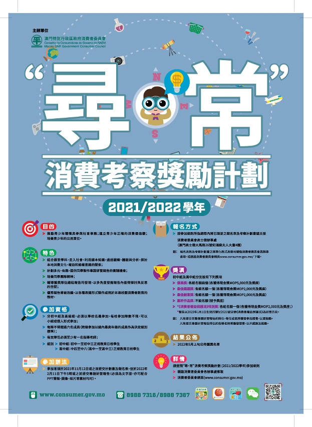 配合第9/2021号法律《消费者权益保护法》于2022年1月1日生效,消委会鼓励参加“寻・常”计划的队伍选择以“消保法”为报告的研习方向,以推动中学生主动关心与认识“消保法”,经评审的报告表现突出,将获授予《消费者权益保护法》研习特别奖(每组名额各一个)。