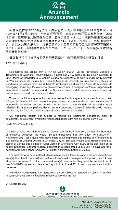 新型冠状病毒感染应变协调中心(下称“应变协调中心”)宣布,因应四川省和重庆市的疫情变化,卫生局根据第2/2004号法律《传染病防治法》第10条和第14条的规定,自2021年11月4日晚上9时起,所有曾经到过四川省成都市锦江区成龙路街道、万年场街道,重庆市渝北区宝圣湖街道、龙塔街道的入境人士,须按照卫生当局的要求在指定地点接受医学观察至离开当地后14天但最短不少于7天。而所有曾经到过上述地方的已入境人士,其健康码将变为黄码及须接受自我健康管理至离开当地 14 天为止,期间须在开始措施的第 1、2、4、7、12 天接受最多 5 次的新冠病毒核酸检测。免费核酸检测预约连结为https://app.ssm.gov.mo/mandatoryrnatestbook。核酸检测结果不会上载至澳门健康码亦不可作为出入境用途。如需将核酸检测结果在澳门健康码显示,则须自费检测。