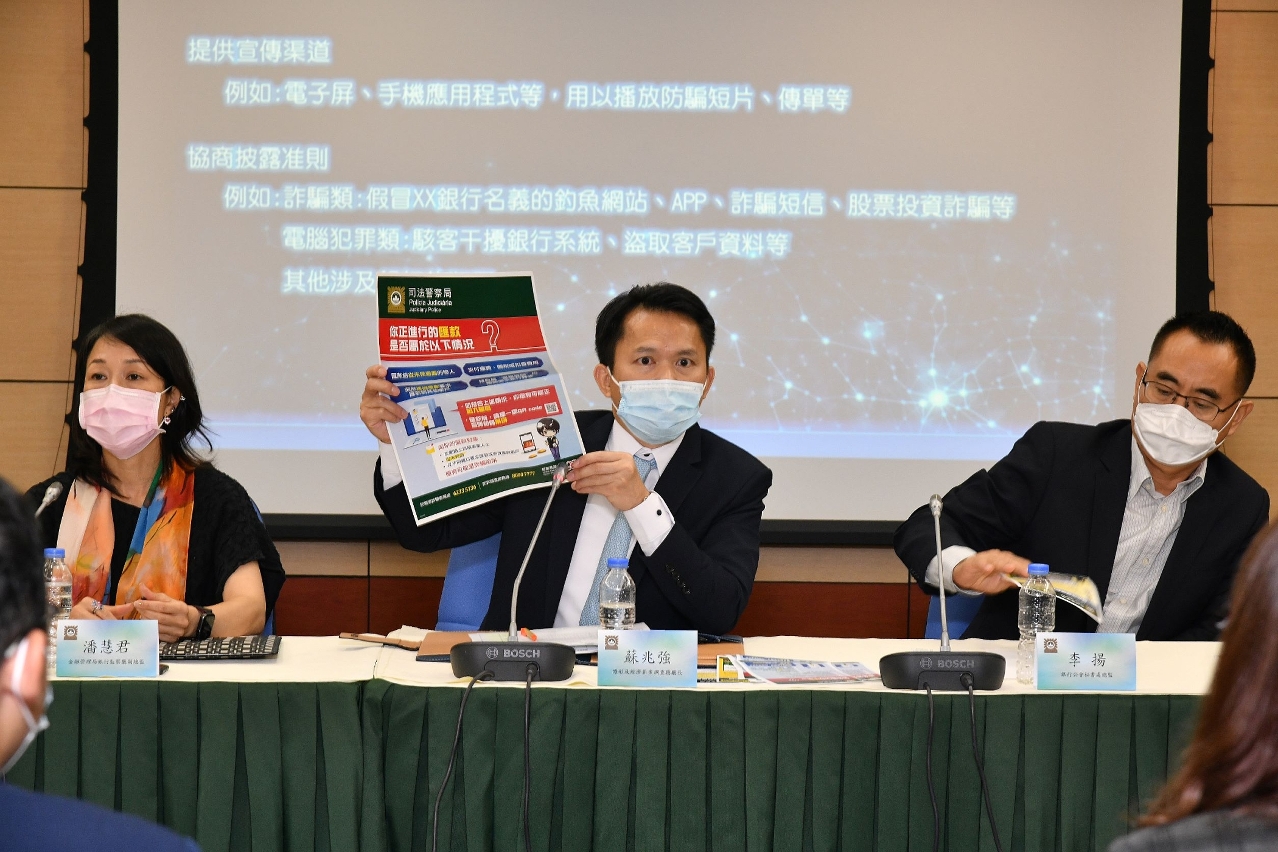 会上,苏兆强厅长简介近年澳门电信网络诈骗案件的概况及总结过去两年执行“可疑汇款劝退措施”的成效。因应近年涉及假冒政府部门人员、“网恋”等电信网络诈骗案件多发,往往导致被害人损失巨大,司警局与银行业界合作于2019年7月推行“可疑汇款劝退措施”,由银行职员处理汇款服务时劝止可能堕入骗案的客户继续汇款,以减少潜在被害人的经济损失。该项措施推行至今成功劝退并阻止相关市民汇出款项达一千多万澳门元,成效显着。