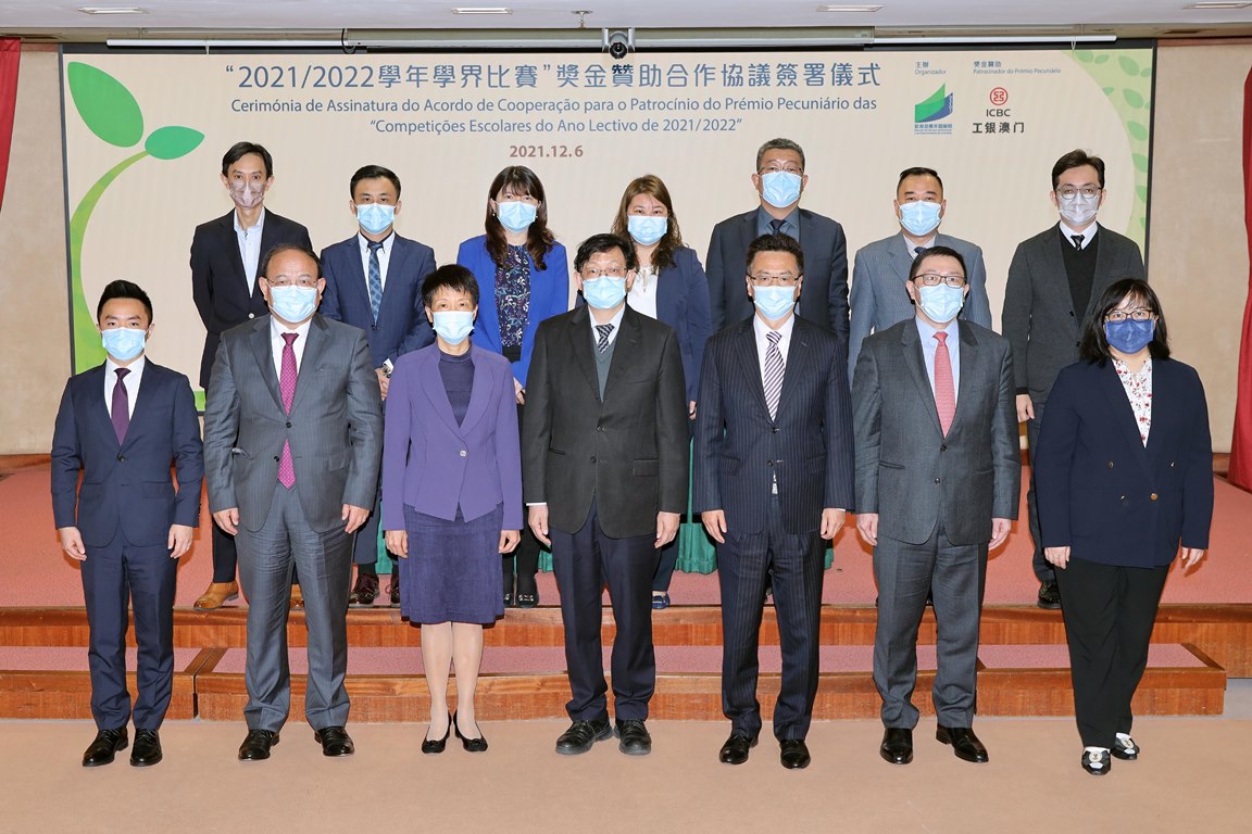 为培养学生对运动、科普、表演艺术等兴趣,同时提供互相观摩及交流的平台,教育及青年发展局每学年均举办多元化的学界比赛,领域涵盖体育、艺术、辩论、数学及科普等项目,而“2021/2022学年学界比赛”中,共有21个学界比赛项目获得中国工商银行(澳门)股份有限公司担任“奖金赞助”单位。为此,教青局于2021年12月6日举行“2021/2022学年学界比赛”奖金赞助合作协议签署仪式,在中央人民政府驻澳门特别行政区联络办公室教育与青年工作部部长徐婷、中国工商银行(澳门)股份有限公司董事长姜壹盛的见证下,教青局局长老柏生与中国工商银行(澳门)股份有限公司副行政总裁陈锦联签署奖金赞助合作协议。
