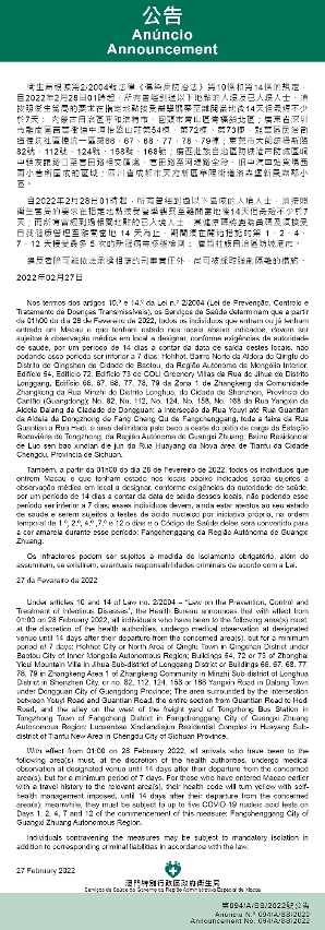 新型冠状病毒感染应变协调中心(下称应变协调中心)宣布,因应内地的疫情变化,卫生局根据第2/2004号法律《传染病防治法》第10条和第14条的规定,自2022年2月28日凌晨1时起,所有曾经到过以下地点的入境及已入境人士,须按照卫生当局的要求在指定地点接受医学观察至离开当地后14天但最短不少于7天:内蒙古自治区呼和浩特市、包头市青山区青福镇北区;广东省深圳市龙岗区吉华街道中海怡翠山庄第54栋、第72栋、第73栋,龙华区民治街道樟坑社区樟坑一区第66、67、68、77、78、79栋;东莞巿大朗镇杨新路82号、112号、124号、158号、168号;广西壮族自治区防城港市防城区峒中镇友谊路口至官田路相交汇处、官田路至河堤路全段、峒中汽车站货场西面小巷所围成的区域;四川省成都市天府新区华阳街道洛森堡新殿蝶郡小区。