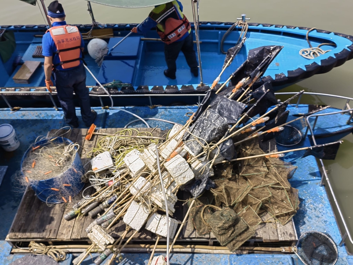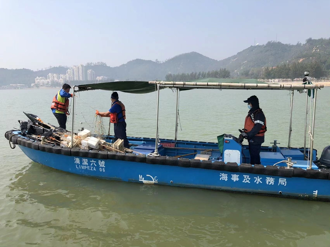 海事局人员昨日在日常巡查时,发现有渔船正在外港航道近岸浮标及氹仔航道进口浮标一带落网捕鱼,该地点为航道出入口附近,有关捕鱼作业违规并会影响其他船只通航,海事局人员即时阻止,并其后在上述海域及黑沙海滩海面清理及没收了阻碍通航的共约1,000米渔网和30支渔标。
