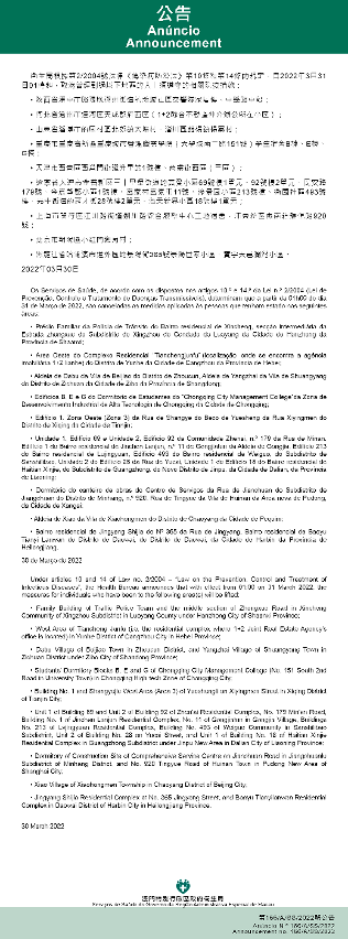 新型冠状病毒感染应变协调中心(下称应变协调中心)宣布,因应内地的疫情变化,卫生局根据第2/2004号法律《传染病防治法》第10条和第14条的规定,自2022年3月31日凌晨1时起,所有曾经到过以下地点的入境及已入境人士,须按照卫生当局的要求在指定地点接受医学观察至离开当地后14天但最短不少于7天:内蒙古自治区赤峰市巴林左旗林东西城街道富河社区赛汗小区;黑龙江省哈尔滨市南岗区的鲁商凤凰城3栋、清滨路14号、林家街10号(汉林美苑小区1号楼)、哈达村,佳木斯市汤原县东湖城的6号楼、16号楼、17号楼、阳光河畔的6号楼、32号楼、阳光花园的24号楼、33号楼;安徽省淮南市凤台县李冲回族乡的民族村、李冲村,刘集镇淝北村;湖南省长沙市雨花区东塘街道现代华都小户型楼栋。