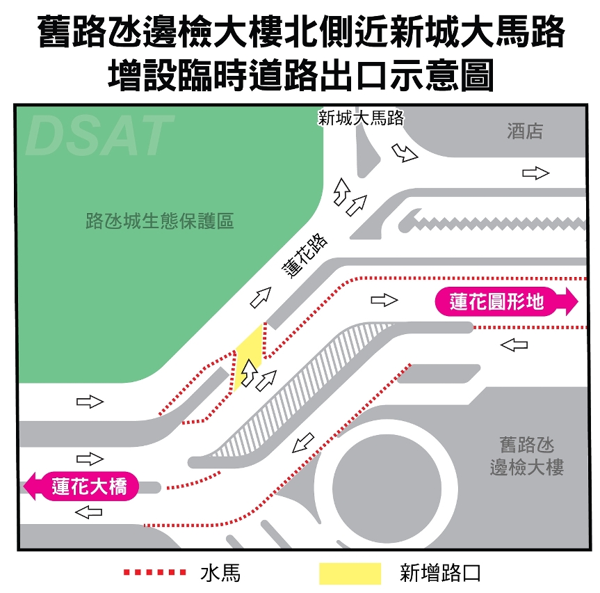 为配合路氹莲花路及莲花圆形地周边的多项大型工程,及疏导莲花圆形地的车流,旧路氹边检大楼北侧靠新城大马路的位置,将增设临时道路出口,以便由横琴口岸经莲花大桥前往氹仔方向之车辆,可直接经由新城大马路驶往路氹城一带。新增之临时道路出口将于4月9日(周六)完成地面标线工作及设置水马后,随即开放通行。