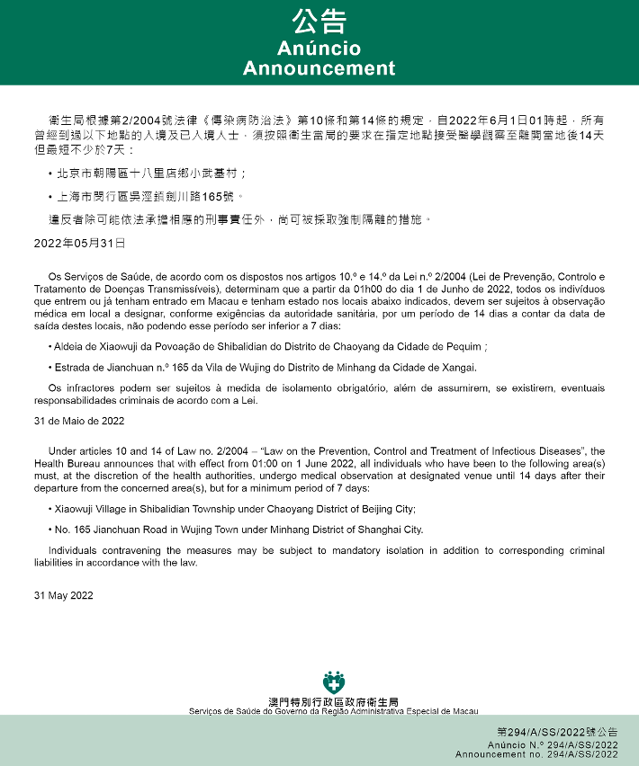 新型冠状病毒感染应变协调中心(下称应变协调中心)宣布,因应内地的疫情变化,卫生局根据第2/2004号法律《传染病防治法》第10条和第14条的规定,自2022年6月1日凌晨1时起,所有曾经到过以下地点的入境及已入境人士,须按照卫生当局的要求在指定地点接受医学观察至离开当地后14天但最短不少于7天: