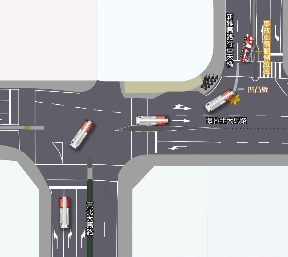 - 经到事故现场实地勘察,慕拉士大马路刚转入新雅马路之道路状况相对不平坦,道路中间有一条比较长的凹凸缝(长约11米、阔约3厘米),左边路面亦较不平整。经分析事发当日之道路视频,在事故车辆第一及第二车轴之轮胎经过中间的凹凸缝及左边之路面后,车辆明显开始向右倾侧,最终翻侧倒卧于新雅马路;
