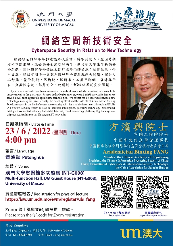 澳门大学将于6月23日(星期四)举办“大学讲坛”讲座,由中国工程院院士方滨兴担任讲者,就“网络空间新技术安全”为题发表演说,探讨新技术不断涌现下网络空间安全态势及其方方面面。