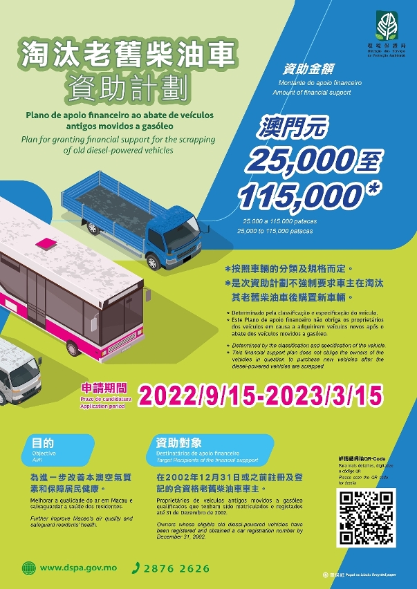 市民可透过环保局网页(www.dspa.gov.mo)、微信公众号或致电“环保热线”(2876 2626)查询资助计划详情。