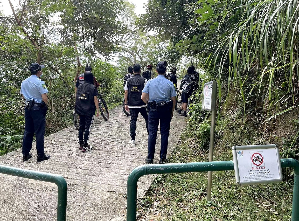 市政署联同警方采取联合行动,早前巡查路环步行径、黑沙水库家乐径及九澳高顶家乐径等多条山林步行径,发现有人士以组队形式在步行径内骑乘自行车,故以违反《公共地方总规章》即场作出检控。市政署呼吁切勿在山林步行径内骑乘自行车,以免发生意外及影响其他行山人士安全,违例者可被检控。
