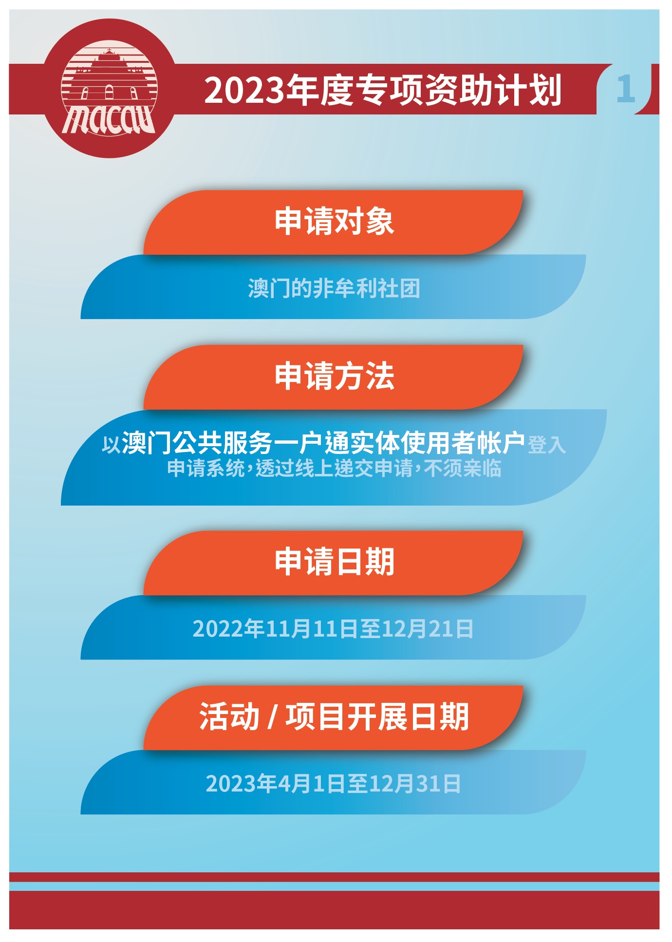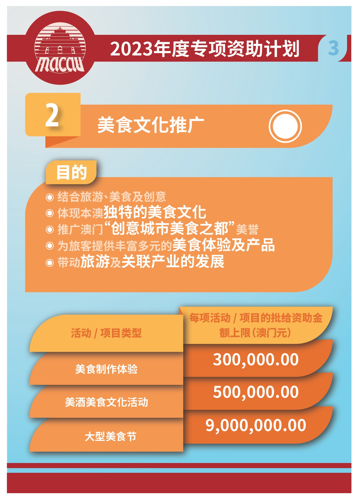 2023年度的“社区旅游经济拓展”、“美食文化推广”和“滨海旅游”专项资助计划于11月11日起接受申请,有意者请以澳门公共服务一户通实体使用者帐户提出申请。