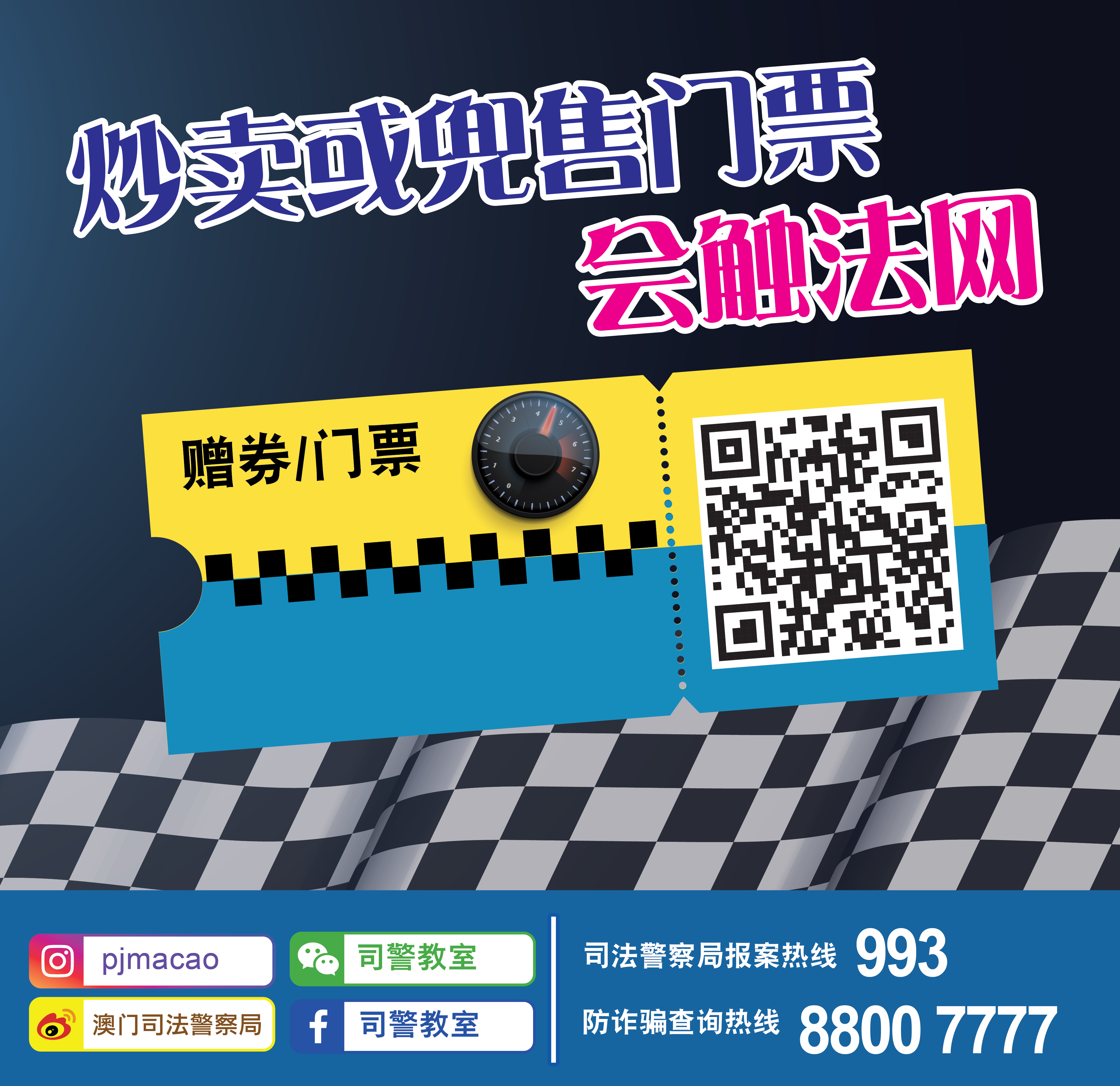 近日,司法警察局发现有人于网络社交平台折价出售第69届澳门格兰披治大赛车门票。司警局提醒市民,切勿炒卖或兜售活动门票、赠券,有关行为可能会触犯法律;同时,市民须警惕网购陷阱,避免购买不明来历的活动门票,勿让骗徒有机可乘。
