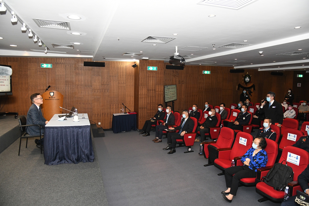 警察总局局长梁文昌联同民防架构成员代表、社区民防联络机制代表及民防志愿者于治安警察局出入境事务大楼一楼礼堂出席是次专题讲座,民防架构及社区民防联络机制成员同时设立了21个线上直播点,现场及线上参与人数逾500人。