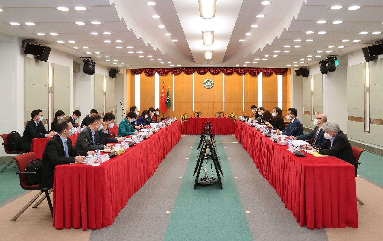 社会文化司欧阳瑜司长今(1)日与北京协和医院名誉院长/中国科学院赵玉沛院士等代表团成员于政府总部举行会议,就“离岛医疗综合体北京协和医院澳门医学中心管理制度”的法案、筹备进度等交换意见。