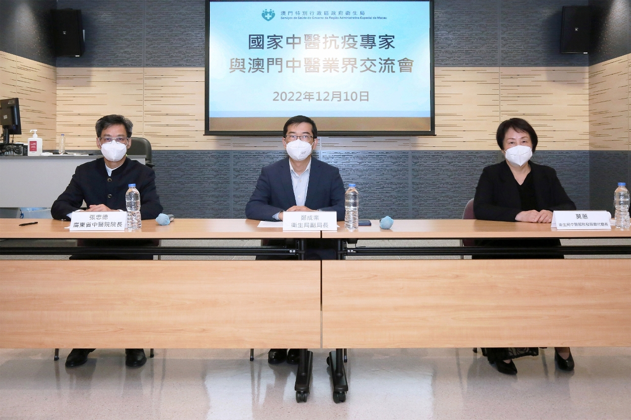 此外,卫生局亦邀请国家中医抗疫专家张忠德教授于12月10日与中医业界人士进行交流。交流会由卫生局郑成业副局长主持,出席的人员包括中医服务发展厅莫蕙代厅长、澳门多个中医药社团代表及中医抗疫小组主要成员。会上,张教授表示中医药在新冠肺炎疫情中临床救治的各个环节发挥了重要作用,获得国家的高度认可,而他对于澳门政府组织中医抗疫的工作表示赞许,并鼓励中医业界在临床采集一线病案资料,主动做好分析总结工作及展示中医救治能力,多向政府建言献策,共同推进中医药的发展。