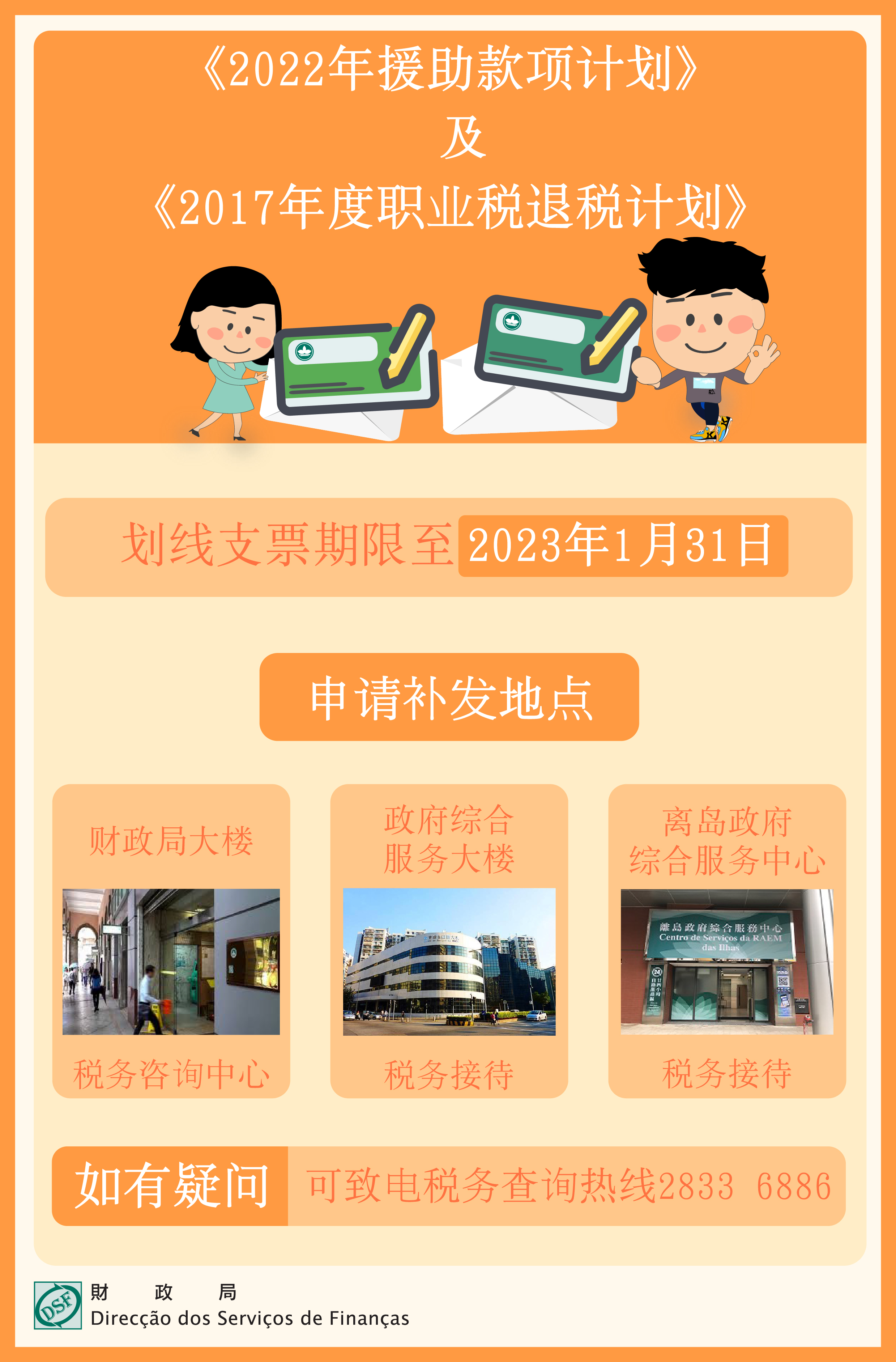 《减轻因2022年疫情对雇员、自由职业者及商号经营者造成负面影响的援助款项计划》及《2017年度职业税退税计划》之支票有效兑现日期截至2023年1月31日,财政局提醒市民应留意。