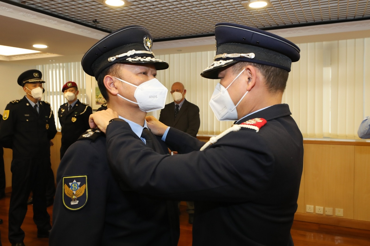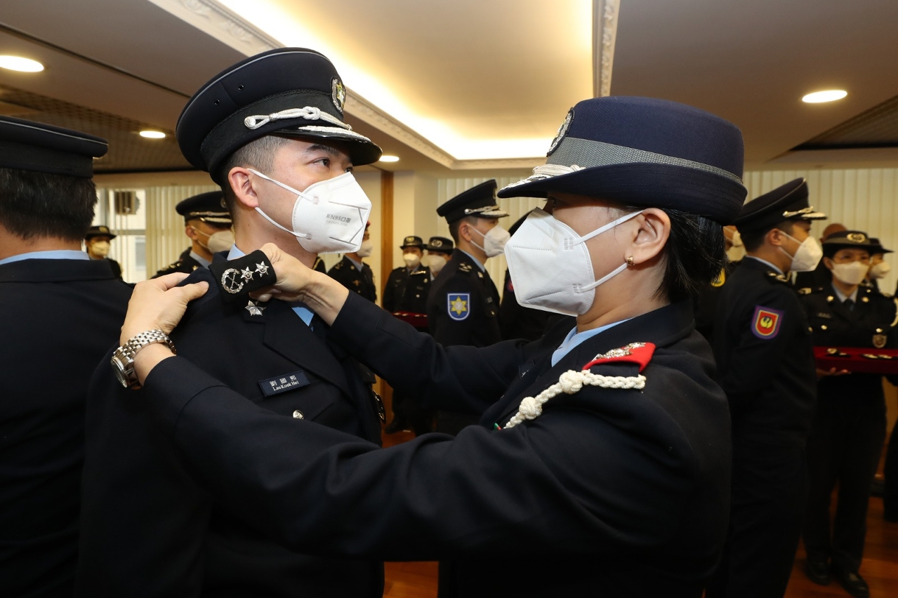 吴锦华局长在仪式上祝贺获晋升的警官,并对他们过往的工作表现予以肯定;同时勉励他们应牢记初心及使命,忠于国家,守护澳门,在岗位上充分发挥自己的才能,与同事同心协力,继续以专业精干的工作态度服务市民,为国家和特区政府的繁荣稳定保驾护航。