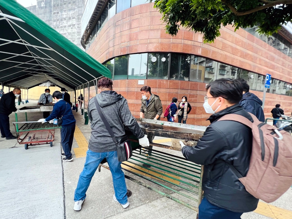 考虑到修复工程需要一定时间进行,结合小贩意见,市政署改以大型帐篷设置临时摊位,加设照明等设备。市政署亦联同澳门市贩互助会,协调受影响的瓜菜小贩透过协商、抽签的方式分配临时经营摊位。工作人员今日已协助小贩把货架等设备搬到临时摊位内。而其他受影响的小贩则全部安排在小贩区内空置摊位。