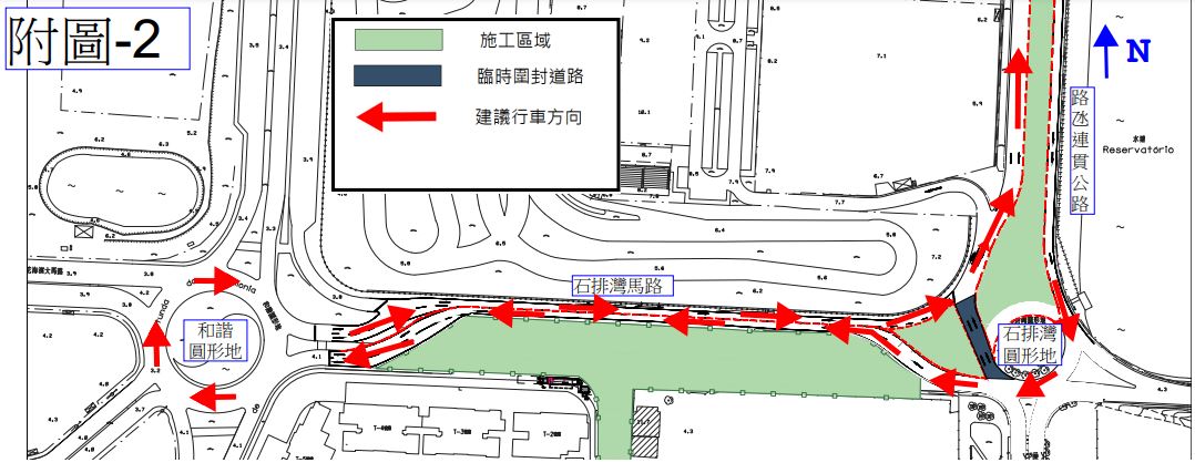 - 2023年2月17日至4月20日期间,晚上10时至翌日早上6时,临时封闭现有石排湾圆形地西侧行车线,届时车辆可绕经石排湾马路及和谐圆形地往路氹连贯公路方向行驶。此外,途经该路段之多条巴士路线需改道行驶,但不影响停靠站点。详情可查阅澳巴网页http://www.tcm.com.mo/web/ 及 新福利网页https://www.transmac.com.mo/。