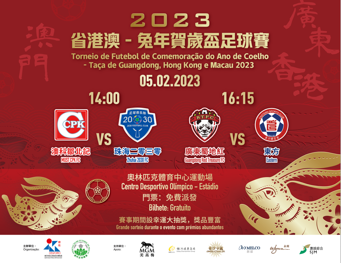 为与市民喜迎癸卯兔年,欢度新春佳节,体育局与澳门足球总会将于本年2月5日于奥林匹克体育中心运动场合办“2023省港澳-兔年贺岁杯足球赛”,活动日下午2时由澳科邹北记对珠海2030,紧接4时15分由广东蜀地红对东方。赛事门票将于本周六(28日)免费派发,派完即止。
