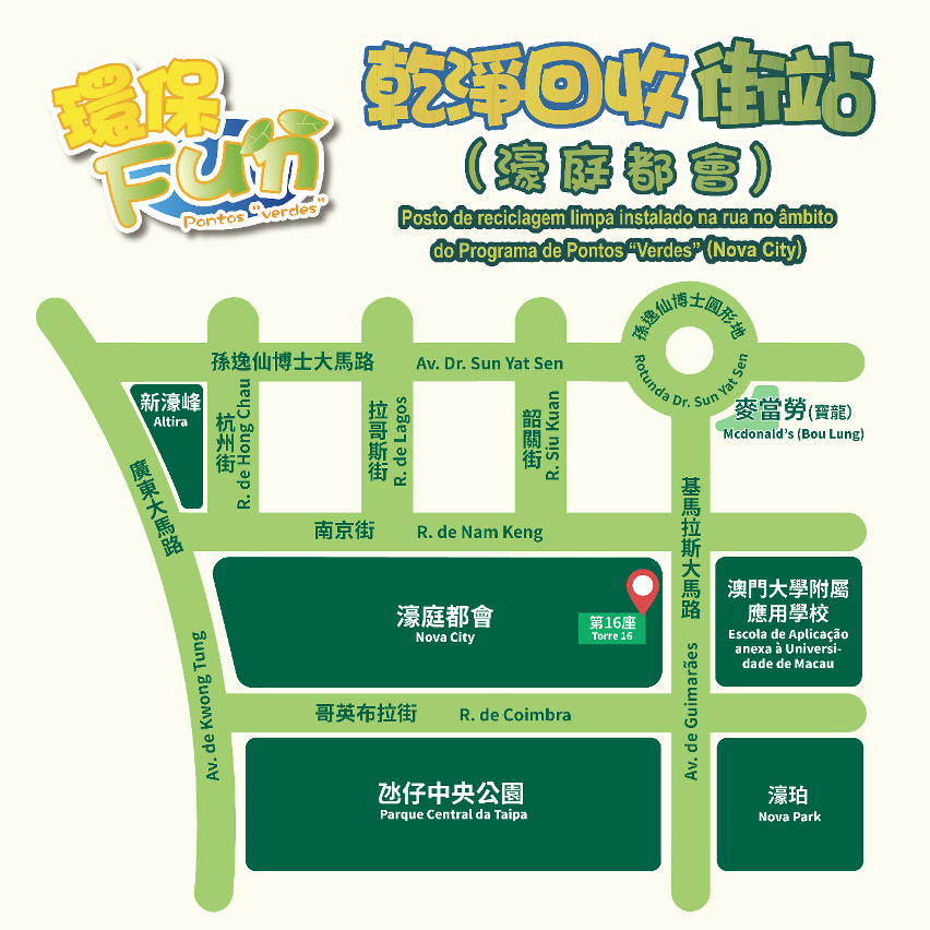 环境保护局持续优化并扩展资源回收网络,今年已率先在氹仔濠庭都会第十六座旁新增一个“环保Fun干净回收街站”,提供更多元化的回收服务、更长的开放时间,便捷市民实践干净回收。