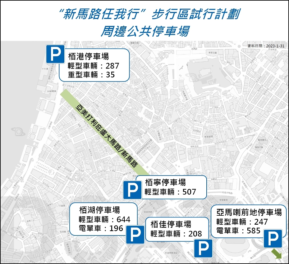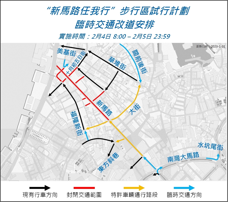 配合文化局续于正月十四及十五举行“新马路任我行”步行区试行计划,2月4日(正月十四)上午8时至5日(正月十五)晚上11时59分,新马路(亚美打利庇卢大马路)及周边道路维持实施封闭交通,部份路段允许特许车辆通行,另部份道路实施反方向行车,以便车辆进出新马路东西两侧区域之道路(详见附图)。上述期间,进入栢宁停车场之所有车辆,须统一经龙嵩正街或傅礼士神父街进入;往返南湾大马路及十六浦方向之车辆,可绕行西湾、妈阁及下环一带再驶回原路线。而火船头街、殷皇子大马路及南湾大马路继续设置临时上落客区供市民使用。