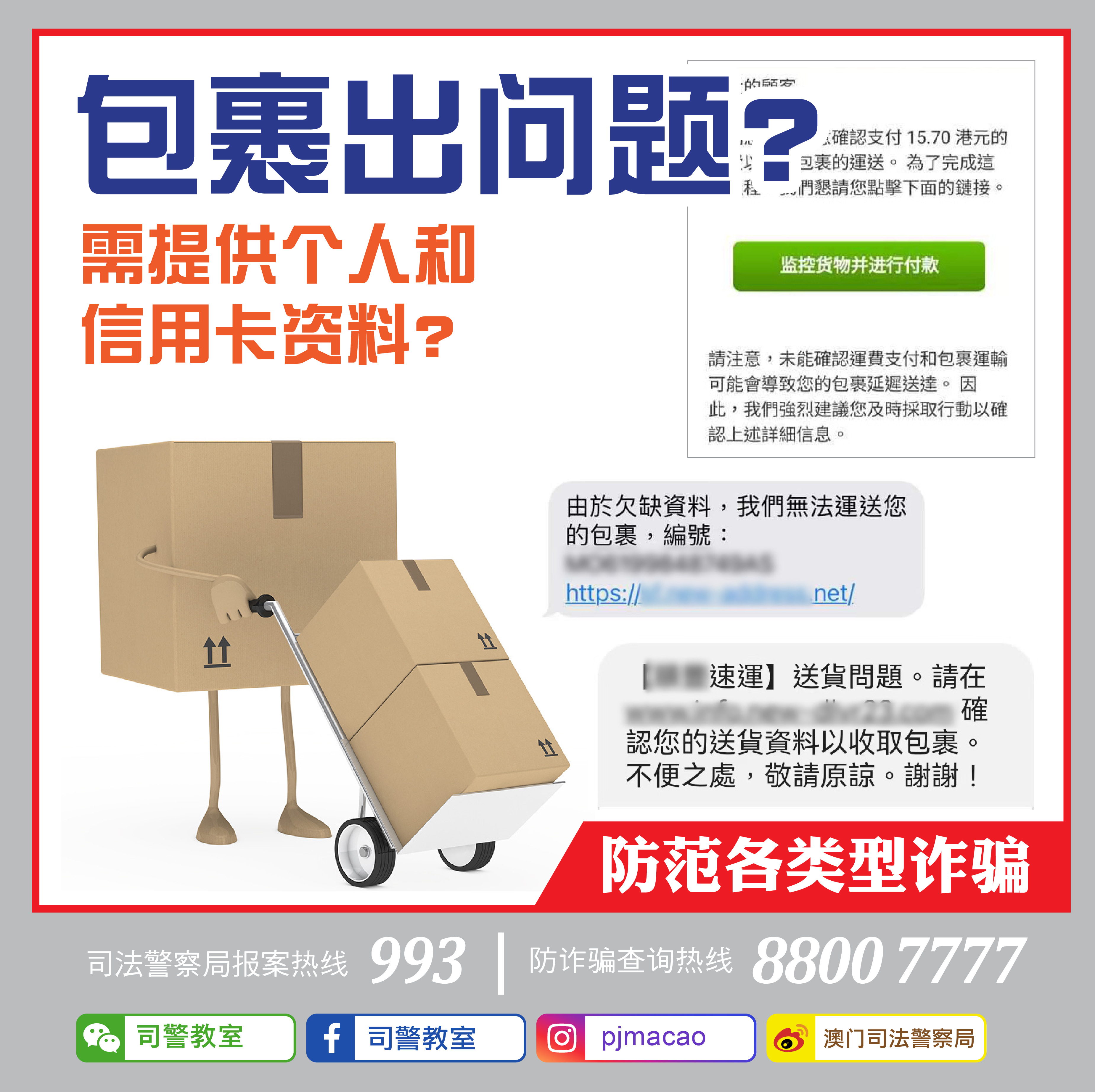司警局近日接获多名市民反映,称手机收到不明来电、附有不明连结的短讯或电邮,均指其包裹因资料不全或运费不足而无法送递,要求提供个人和信用卡资料。