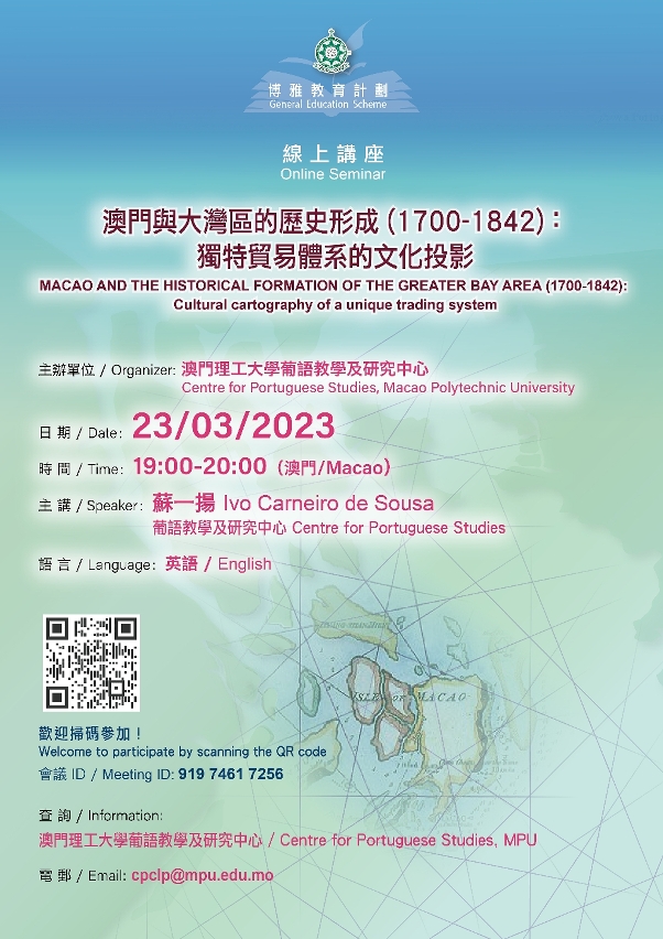2023年适逢国家《粤港澳大湾区发展规划纲要》公布四周年,澳门理工大学葡语教学及研究中心于3月23日(星期四)举办“澳门与大湾区的历史形成(1700-1842):独特贸易体系的文化投影”专题讲座,由中心副教授苏一扬(Ivo Carneiro de Sousa)主讲,欢迎有兴趣人士参加。