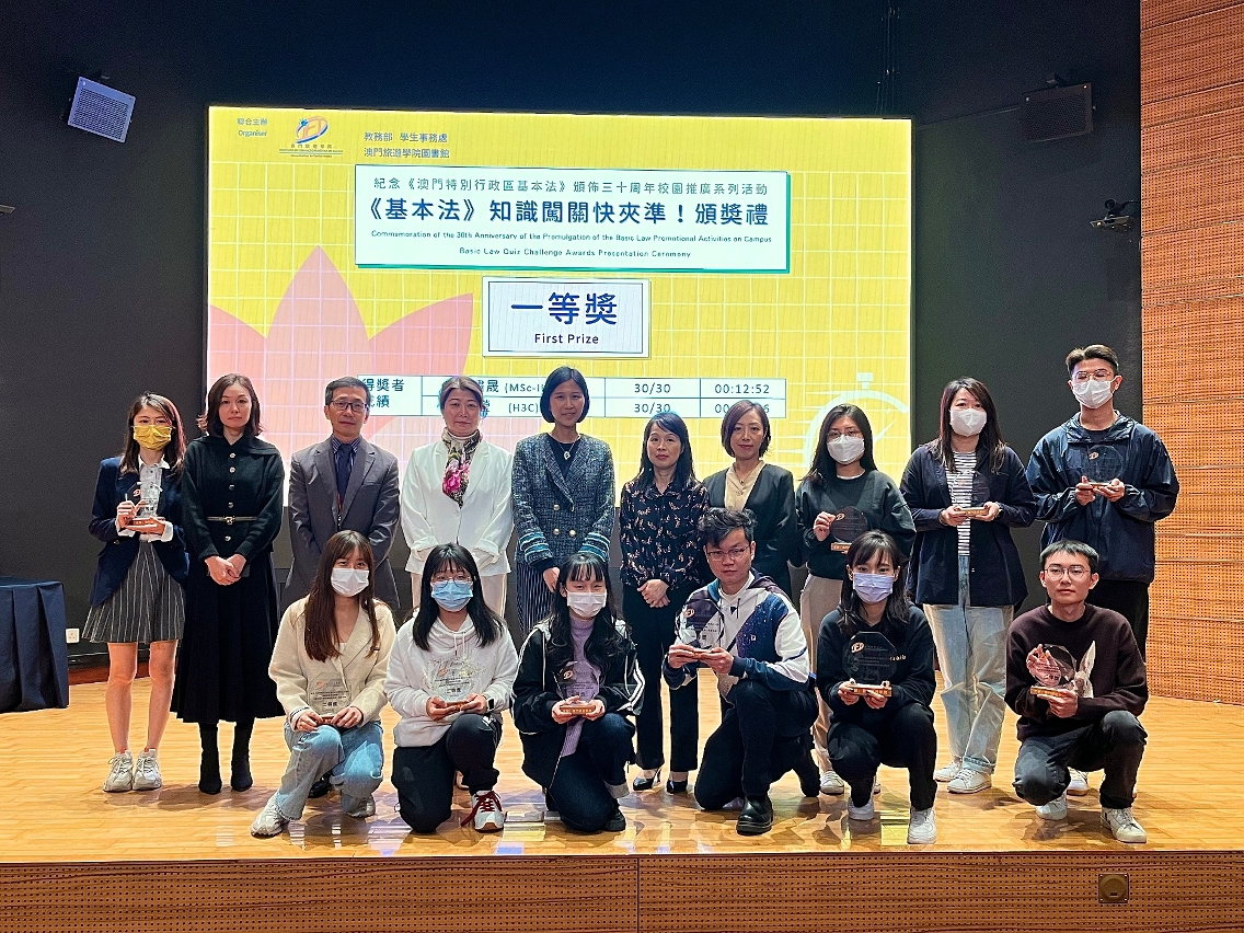 三月十五日至二十六日线上举行的“《基本法》知识闯关快夹准!快答挑战”答问计时比赛,邀请学院全体学生参加,比赛要求回答准而快,逾百学生参与。活动除了提高学生对《宪法》、《基本法》及「一国两制」内容的认识,同时促进学习《基本法》的风气和增强学生的国家观念。学院于三月二十九日在望厦校区进行颁奬仪式,向获得一等、二等及三等奖的学生颁奖,以鼓励学生们在比赛中取得的优异成绩。出席的学院代表包括澳门旅游学院吕剑英副院长、罗曼仪副院长、教务部林宝玉教务长、学生事务处朱振荣处长、图书馆李嘉汶馆长及梁诗琪讲师。