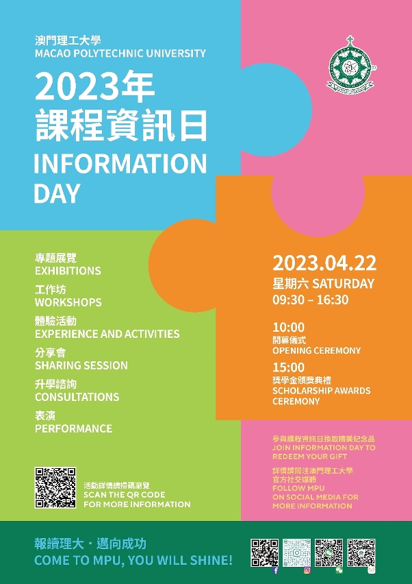 有关课程资讯日的精彩活动,请扫描海报二维码,或浏览澳理大官方微信:mpuadmission或Facebook专页。