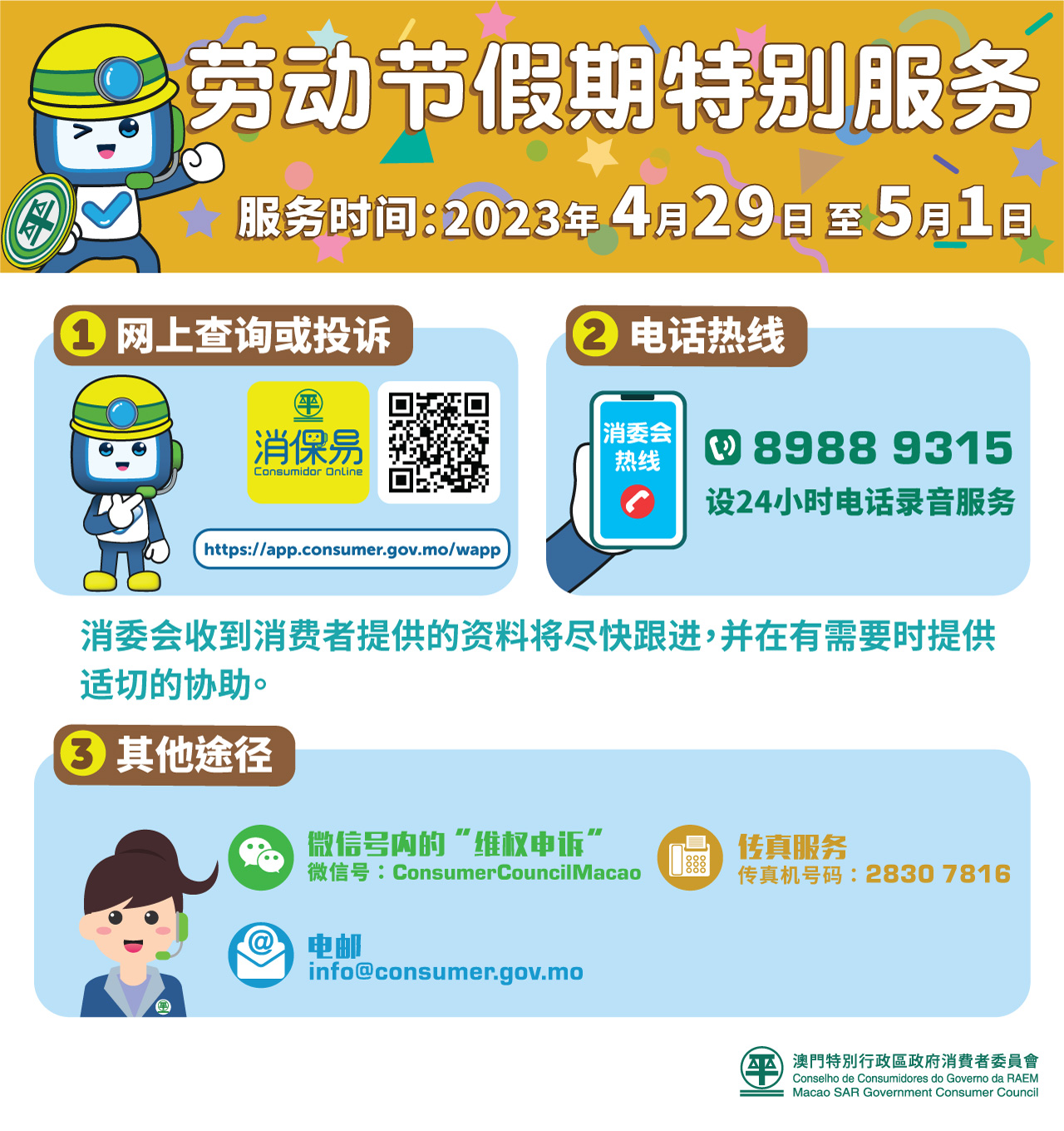 消费者委员会配合“五•一”劳动节假期,由4月29日(周六)至5月1日(周一)安排一连三天特别服务,为消费者提供查询或投诉服务。