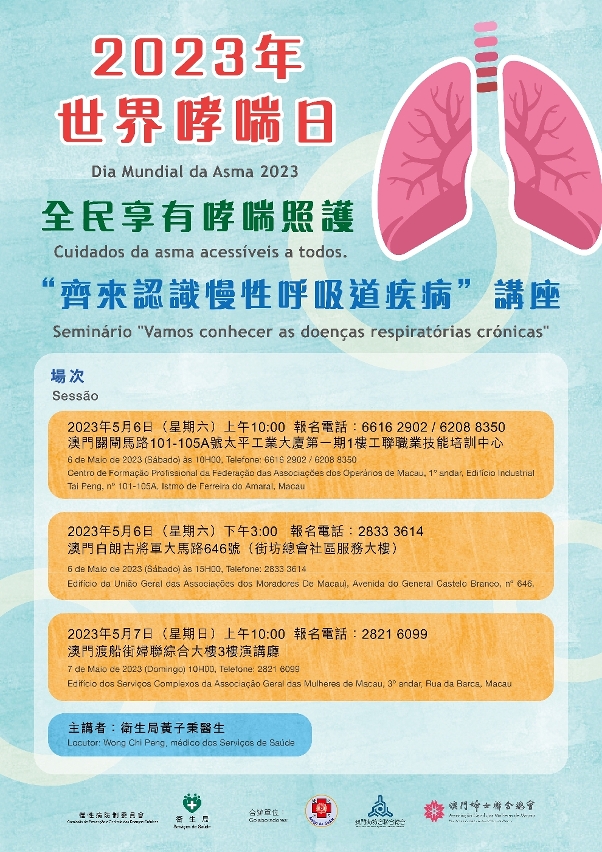 卫生局为响应“世界哮喘日”的倡议,联同慢性病防制委员会成员澳门街坊会联合总会、澳门工会联合总会和澳门妇女联合总会,5月6及7日合办“齐来认识慢性呼吸道疾病”的社区讲座,共3场次,向居民科普哮喘及慢性阻塞性肺病两种最常见慢性呼吸道疾病的成因及预防方法,加强居民对慢性呼吸道疾病的认识,尽早做好保健预防措施。