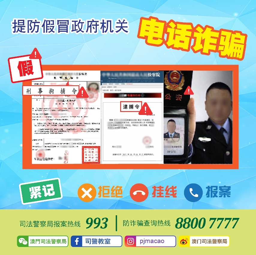 近日司法警察局接获多名市民举报,指分别接到假冒内地及本澳政府部门或机构人员之诈骗电话,幸因大部分市民早前已接收过司警局发送的防骗资讯而识破骗局;然而,仍有少部分事主因误信骗徒而招致损失。