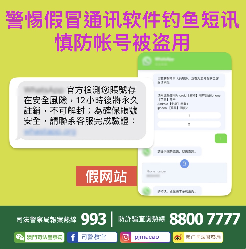 近日,司法警察局发现有不法分子假冒官方通讯软件公司向市民发送附有不明连结之短讯,讹称其手机通讯软件帐户“存在安全风险及将被注销”,诱骗市民点击短讯内的连结及跳转至假冒客服聊天机械人,随后事主输入手机号码及验证码等资料,骗徒企图藉此盗取相关通讯软件的帐号使用权。
