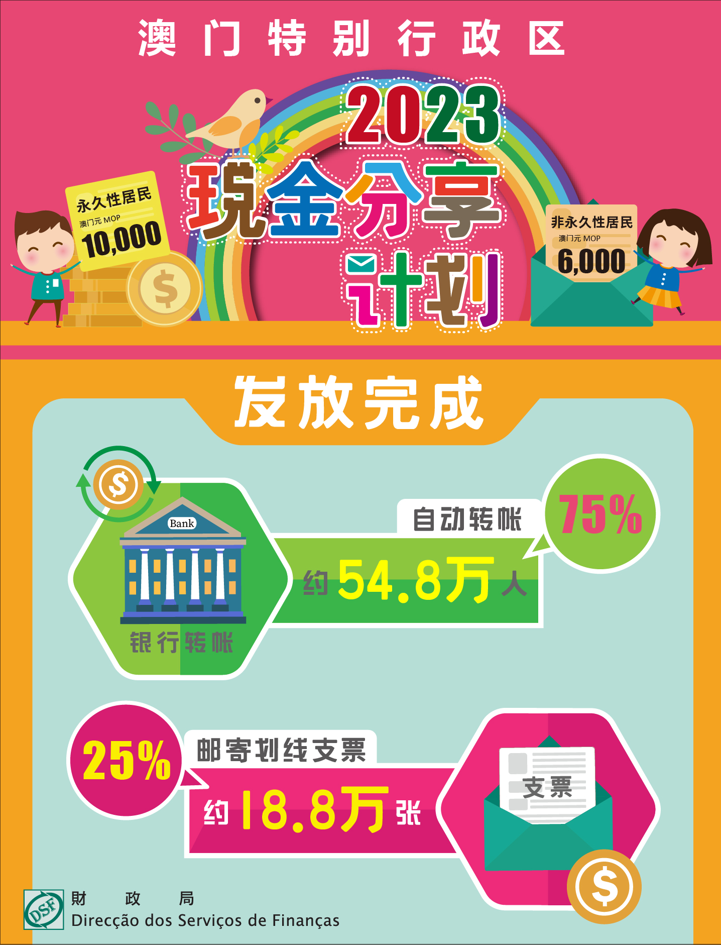 “2023年度现金分享计划”自今年7月4日开始发放至8月4日完成。期间分批向澳门永久性居民每人发放1万澳门元,以及向非永久性居民每人发放6千澳门元。特区政府已透过银行转帐向近54.8万名居民发放约53.8亿元的现金分享款项,另外邮寄划线支票约18.8万张,涉及款项约18.5亿元。