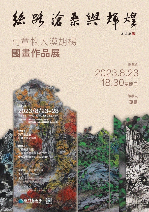 由澳门基金会、新疆美术家协会主办,新疆通嘉集团、民盟中央美术院新疆分院、中国胡杨艺术研究院新疆分院协办之“丝路沧桑与辉煌──阿童牧大漠胡杨国画作品展”将于2023年8月23日(星期三)18:30,在澳门教科文中心展览厅及多功能厅揭幕,展出艺术家阿童牧的胡杨国画作品近100幅。
