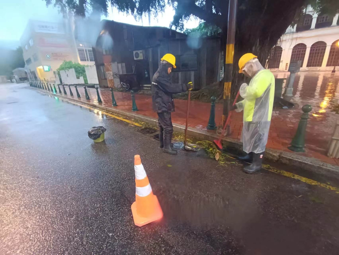 「苏拉」袭澳期间,市政署持续派员在安全情况下清理渠口及路边杂物,并用人手打用渠盖疏导雨水,保持渠道畅通。
