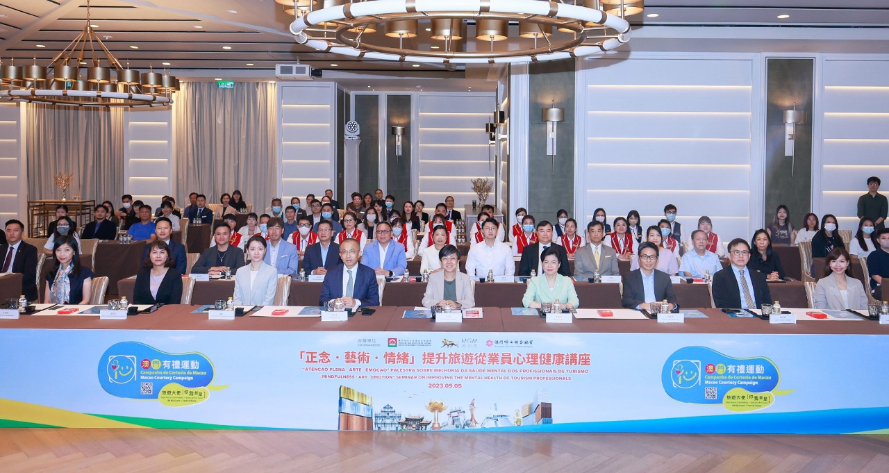 旅游局与美高梅及澳门妇女联合总会合办的“正念 · 艺术 · 情绪”提升旅游从业员心理健康讲座今(5日)于美狮美高梅举行。讲座以正念为主题,结合艺术创作,提升旅游业界从业员的职业心理素质,打造澳门有礼城市的形象,巩固世界旅游休闲中心地位。