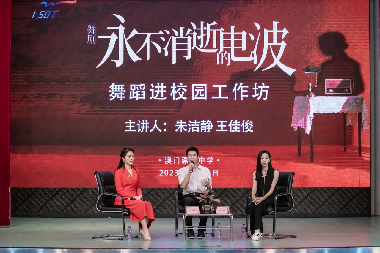 大型舞剧《永不消逝的电波》由上海歌舞团担演,日前于本澳多所学校举办“舞蹈艺术交流进校园工作坊”,当中包括澳门演艺学院、澳门坊众学校、濠江中学及劳校中学附属小学。上海歌舞团创演艺人与学生分享当代舞剧的创作历程,舞者融入角色在肢体上流露细节的技巧,鼓励大家都能够像革命先烈般坚持信念,在自己所爱的事业上发光发亮。舞剧男女主演即席演示剧中情感洋溢的双人舞,并带领学生学习《渔光曲》编舞段落,亲身感受舞剧《永不消逝的电波》的独特之处。师生们均全程投入,场面热闹。