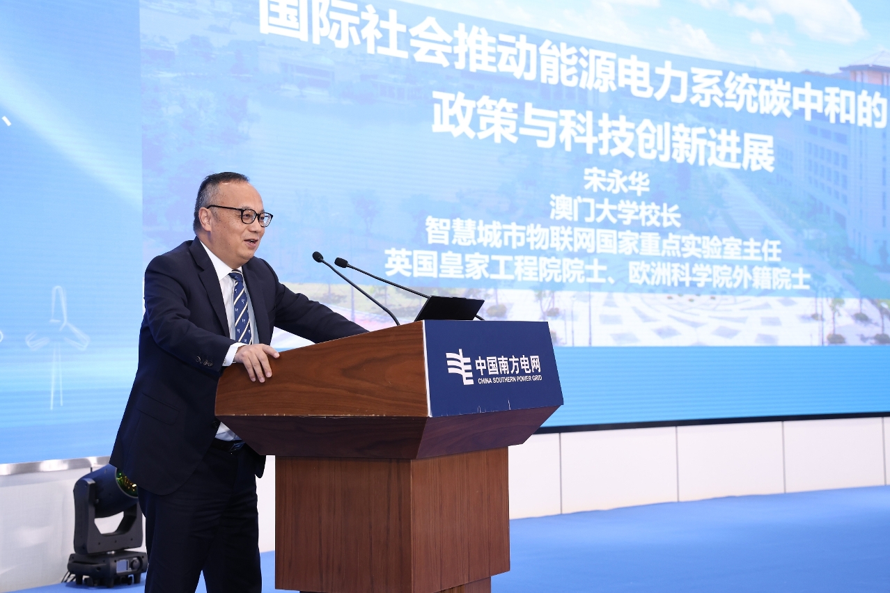 宋永华发表的大会主旨报告为“国际社会推动能源电力系统碳中和的政策与科技创新进展”,探讨英国、欧盟等国际社会在气候变化、碳排放政策机制、净零碳能源系统转型、数字化能源系统等领域的最新政策战略和科技创新进展,尤其介绍了澳大在碳中和技术创新领域的研究工作,基于智慧城市物联网国家重点实验室、珠海澳大科技研究院、中国南方电网有限责任公司—澳门大学碳中和智慧能源电力联合实验室等研究平台,澳大开展了澳门碳中和路径研究、澳门电动车充电发展规划研究、综合能源物联网的智能协同管控与防护关键技术应用研究、基于光储直柔的低碳园区多能协同与碳管控技术研究与应用等,助力澳门、大湾区乃至全国能源电力行业创新发展。