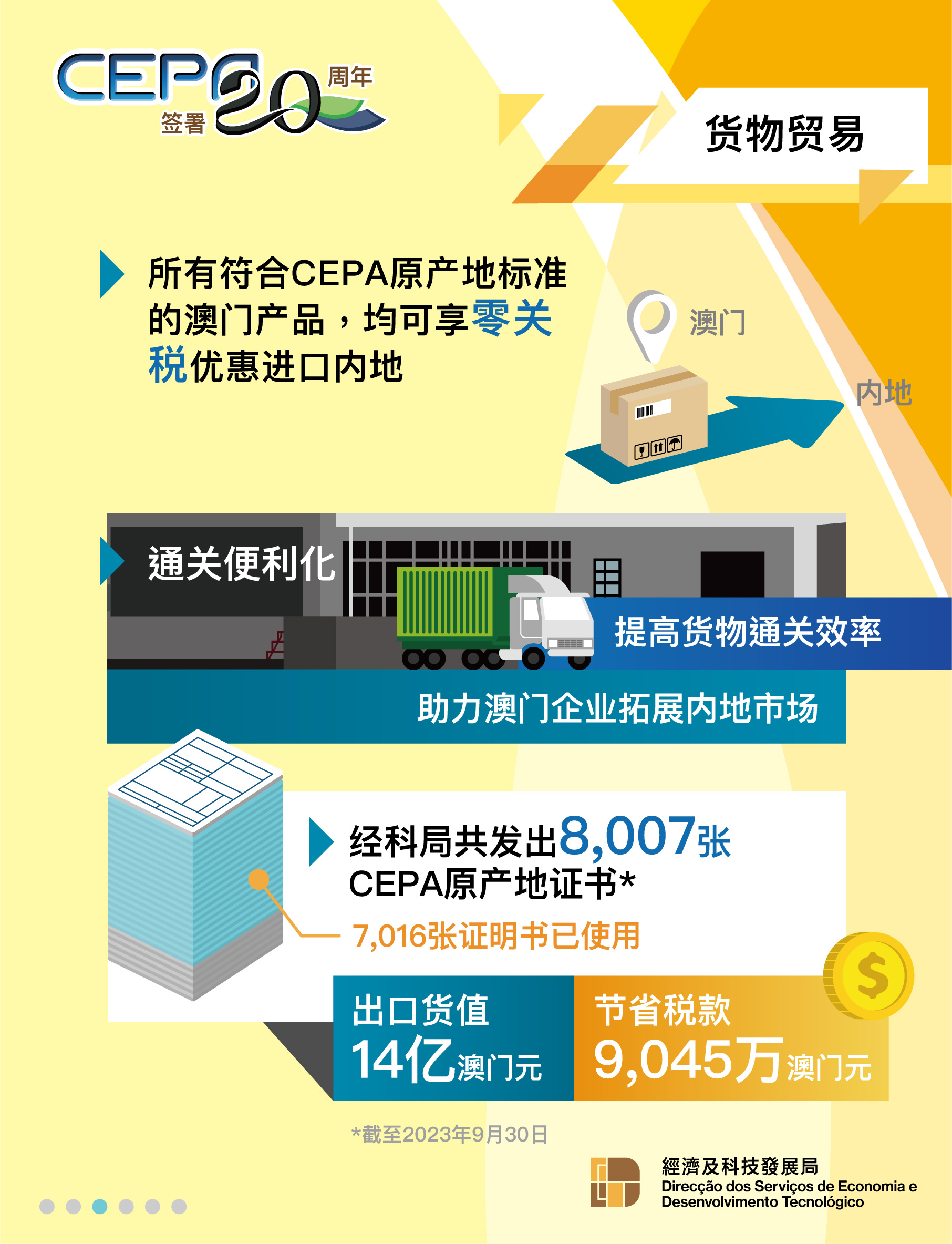 货物贸易方面,所有符合CEPA原产地标准的澳门产品出口内地时均可享零关税优惠。由CEPA实施以来至今年9月,澳门企业利用CEPA零关税优惠政策出口至内地的货值达14亿澳门元,为澳门企业共节省累计超过9千万澳门元关税。