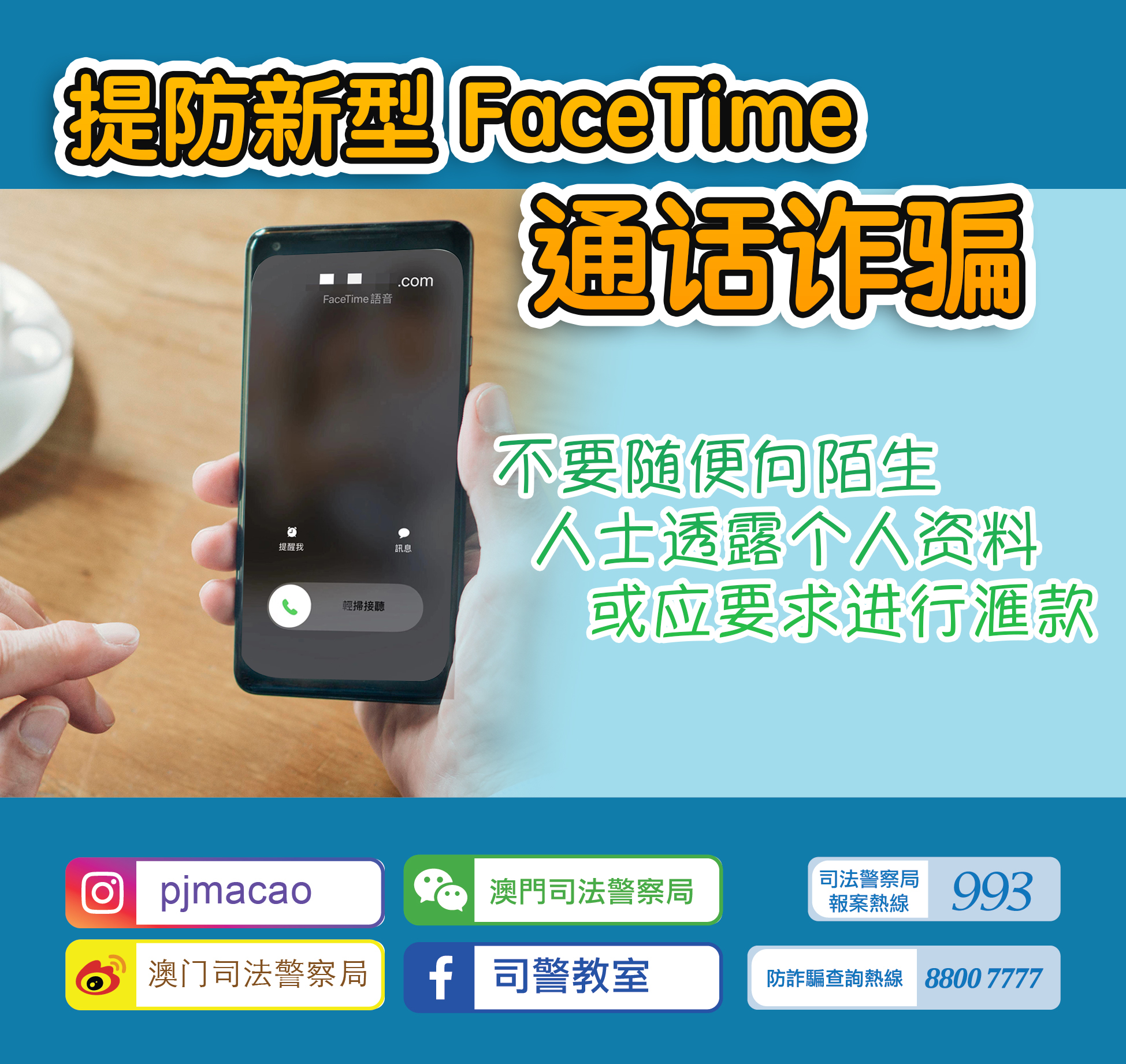 司警局反诈骗协调中心呼吁市民,小心提防陌生的FaceTime来电,切勿轻信自称客服人员打来的电话,不要随便向陌生人士透露个人资料或应要求进行汇款,应循有关公司或机构之官方途径进行查询核实情况。
