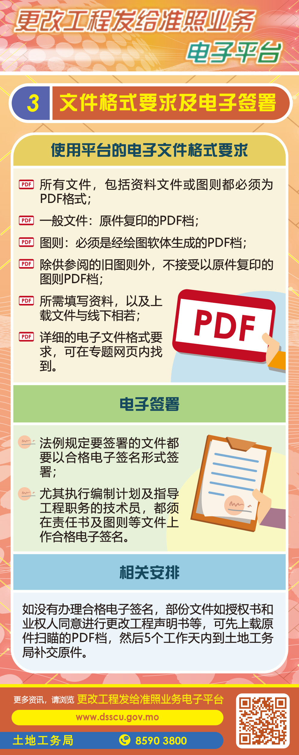 更改工程发给准照业务是工务局电子入则工作首阶段实施的项目,以配合特区政府落实电子政务工作、响应环保及方便市民和业界。申请人可全天候透过平台提交及补充文件等资料、下载已核准图则及工程准照、缴交费用等,以及检视部门回覆公函等文件(正式公函仍会透过挂号信形式发出)。局方提醒,使用平台须开通个人一户通或实体帐户,而法例规定须签署的文件均须以合格电子签名形式签署。