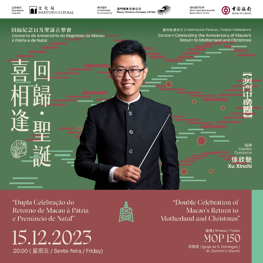 澳门中乐团将于12月15日晚上8时在玫瑰堂举行回归纪念日及圣诞音乐会《回归‧圣诞喜相逢》,由澳门中乐团助理指挥徐欣驰执棒,乐团唢呐首席田丁担任独奏,门票现正于澳门售票网发售。